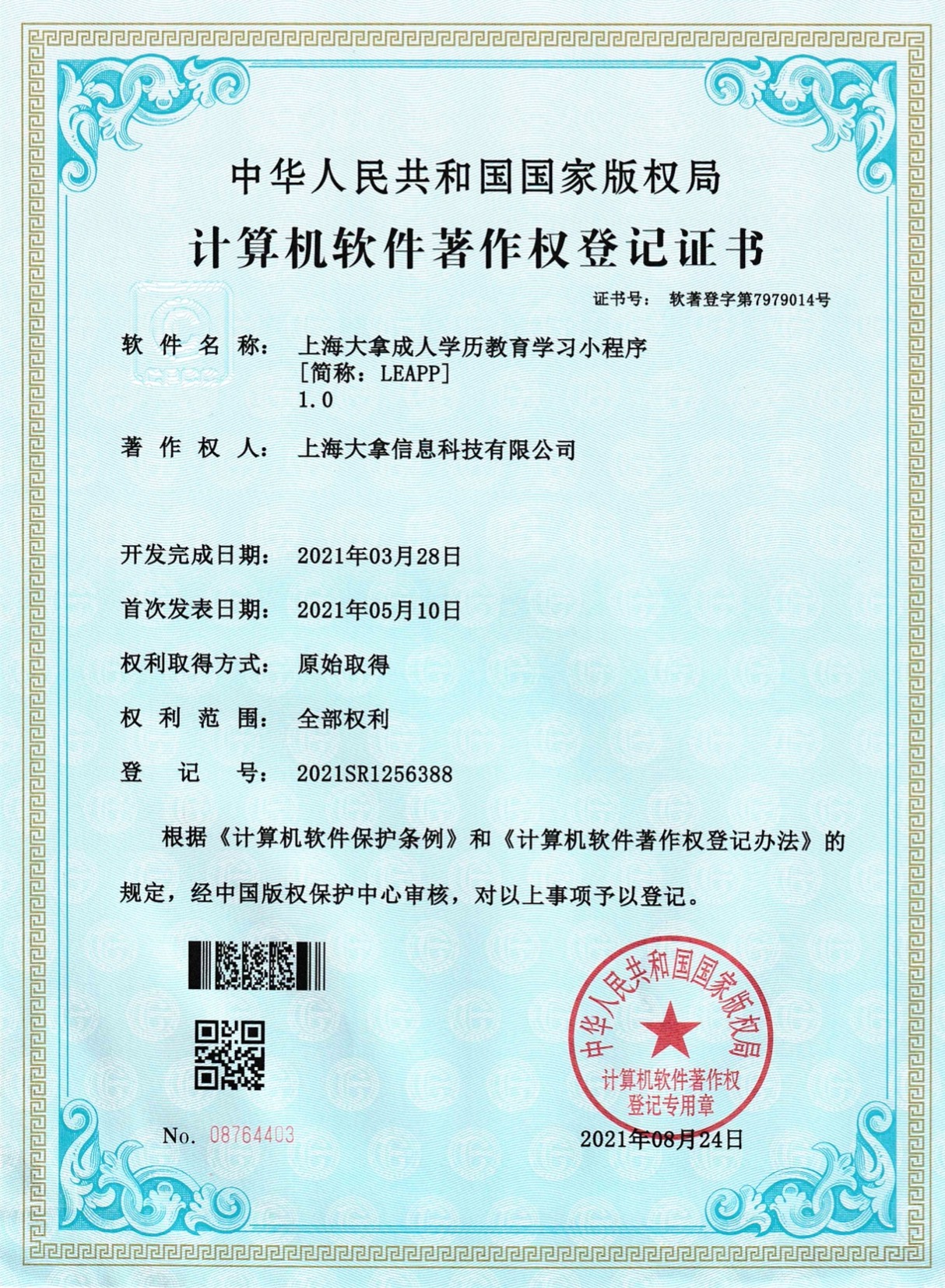 2021年8月24日,上海大拿信息科技有限公司自主研发的《上海大拿成人学历教育学习小程序V1.0》(简称:LEAPP)正式获得国家版权局计算机软件著作权认证(证书号:软著登字第7979014号,登记号:2021SR1256388)。该程序于2021年3月开发完成。