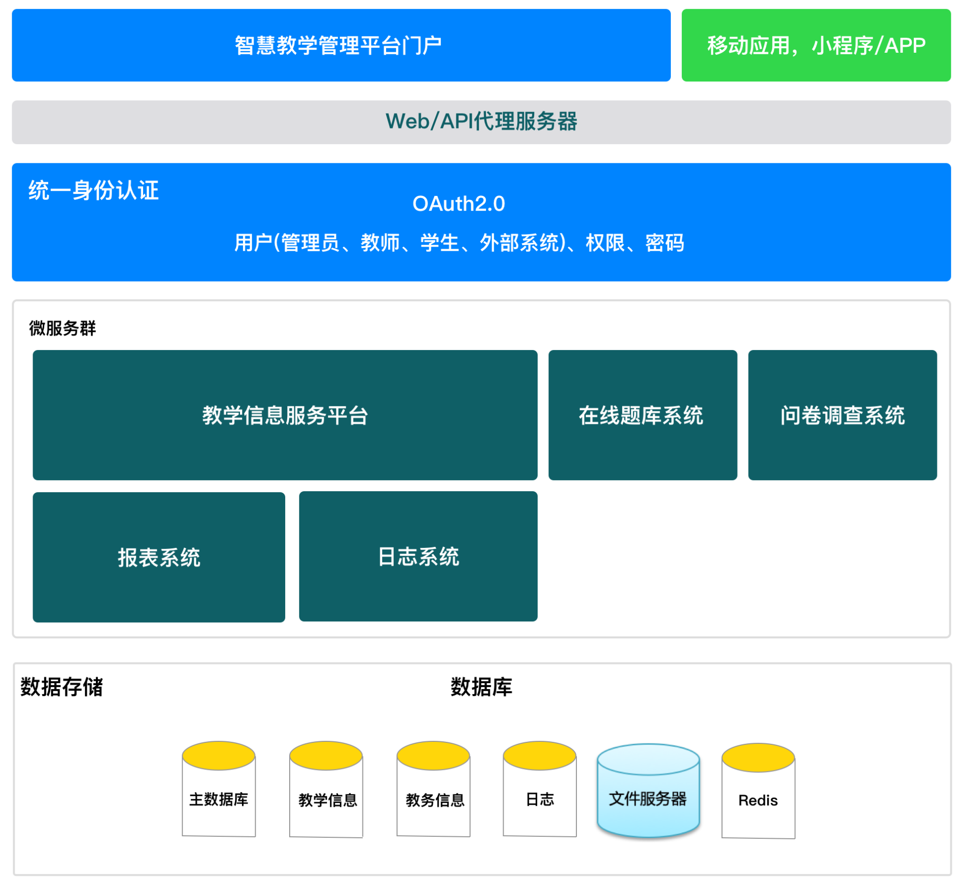 2)教学管理系统存储学生学籍信息、班级信息、课程信息、考试信息、成绩信息、教学过程数据等内容,通过相关API接口与统一身份认证系统共享学生基本信息。