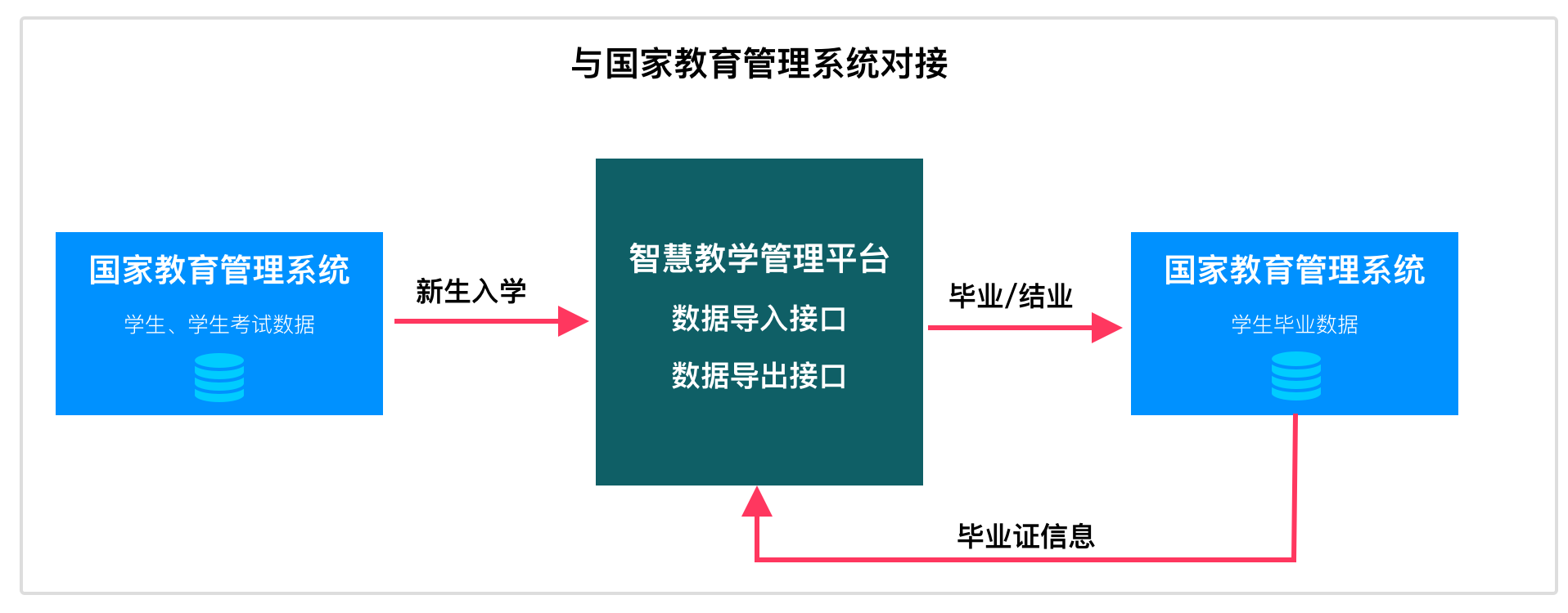 1)智慧教学管理平台根据最终客户具体需求,提供对应导入接口,接收国家考试系统的数据,解析格式,把数据完整入库。