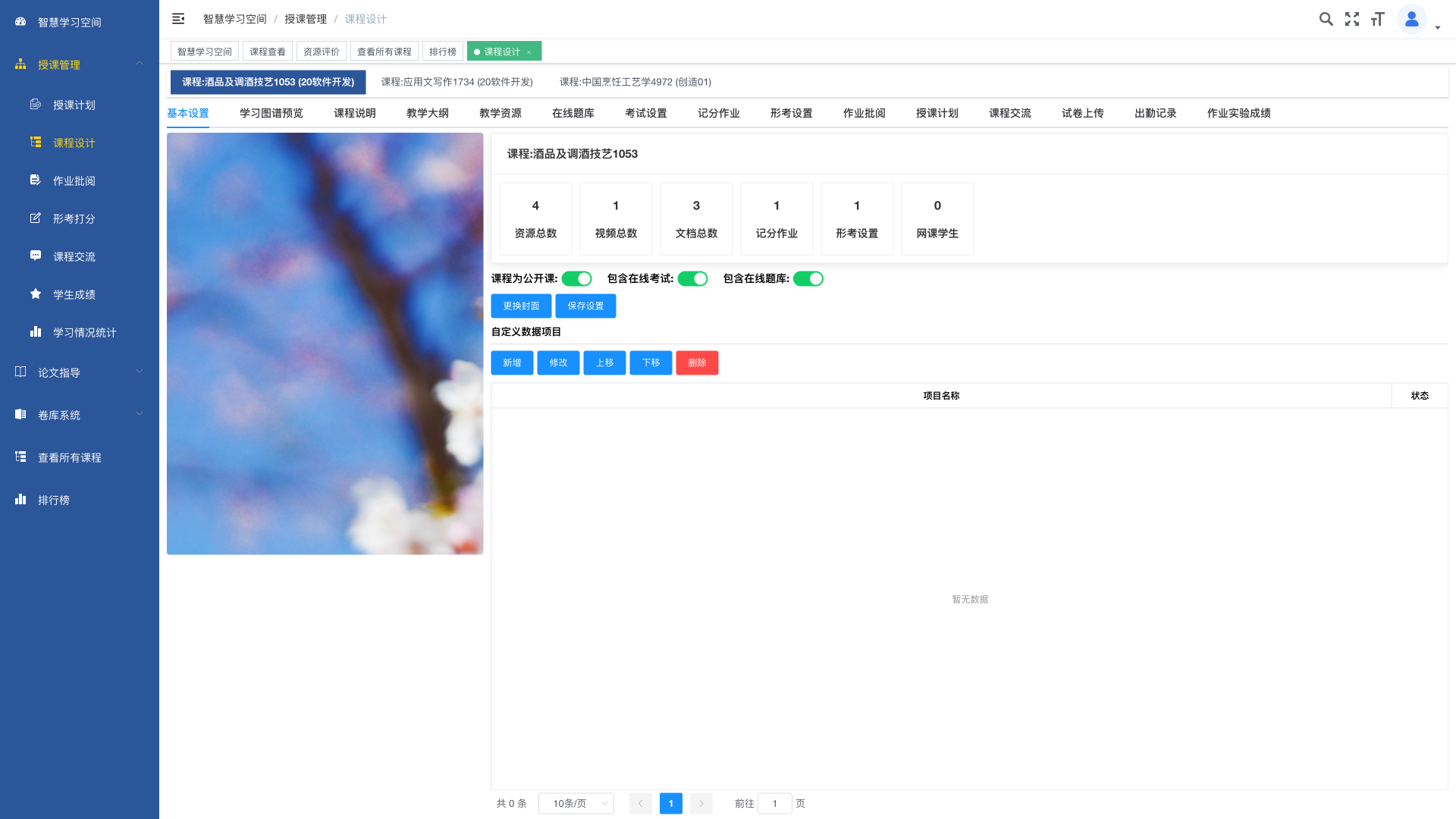 提供用户登录、系统权限、角色管理、用户管理、公告管理、登录日志、开课管理、班级管理、学年学期、BBS在线日志、课程信息统计、学习行为统计、教师空间(教师)、授课计划、课程设计、作业批阅、形考打分、课程交流、学习情况统计、学生成绩、课程信息统计、论题审核、指导评价、学习空间(学生)、我的课程、作业提交、课程交流、形考成绩、在线选课、毕业论文、在线考试、成绩查询等功能。